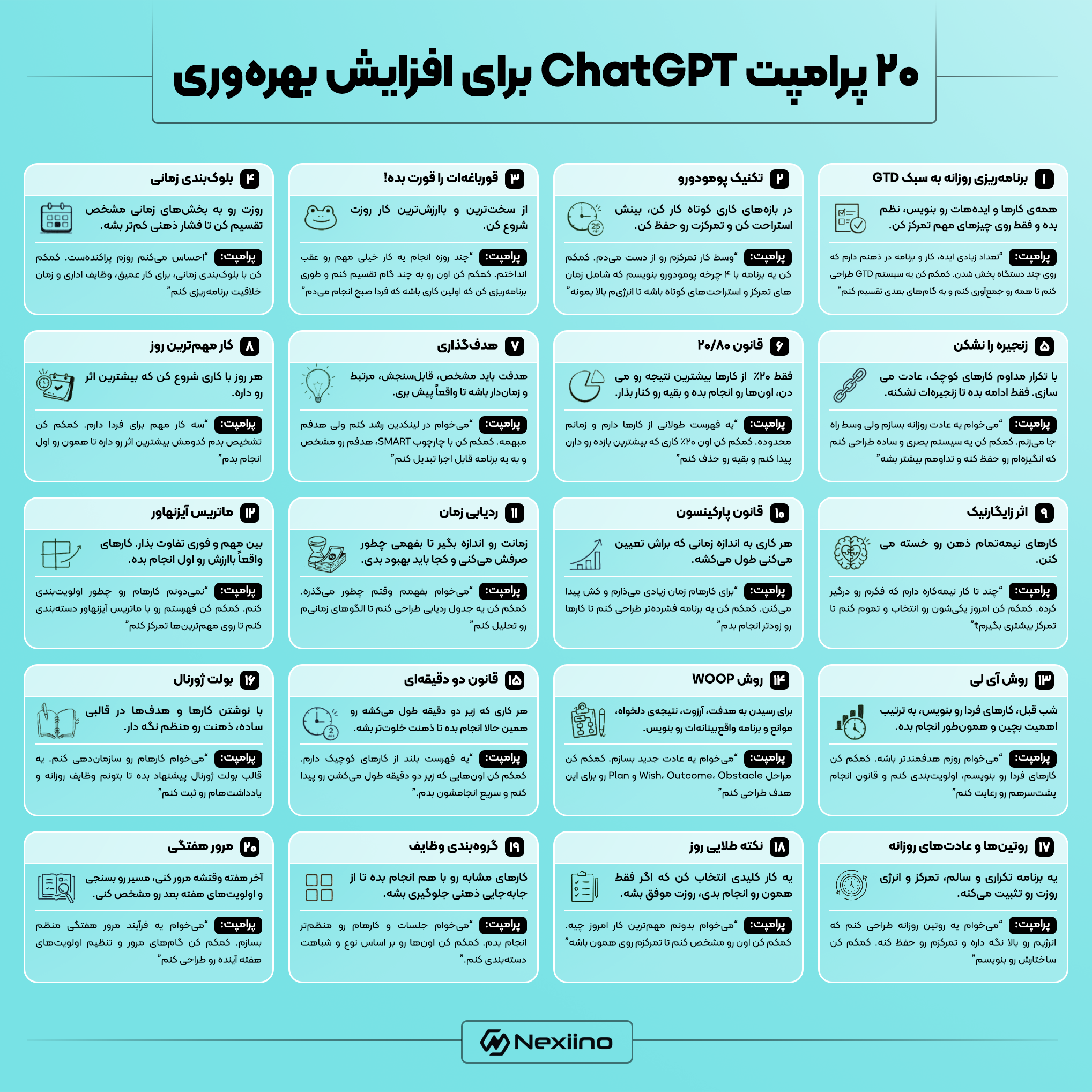 در نکسینو، مجموعه‌ای از ۲۰ پرامپت کاربردی ChatGPT طراحی کرده‌ایم که بر پایه معتبرترین روش‌های جهانی بهره وری ساخته شده‌اند.